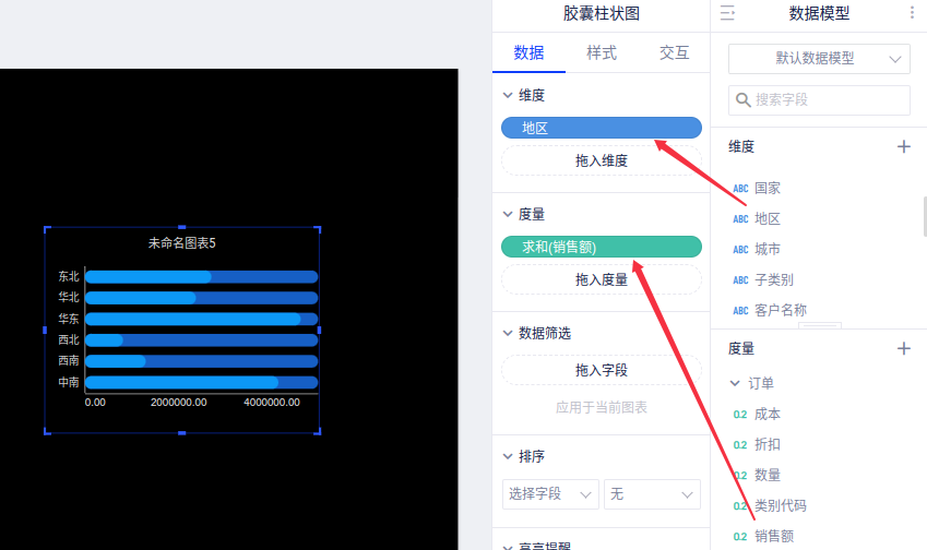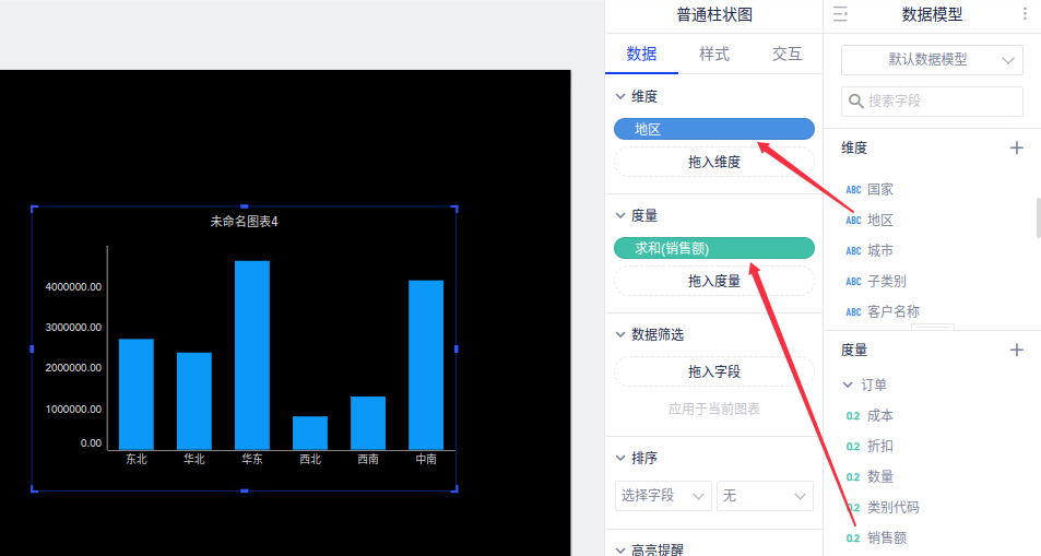 例如,我们需要看“每个地区的销售额”柱状图,将涉及到2个字段:维度“地区”,度量“销售额”。