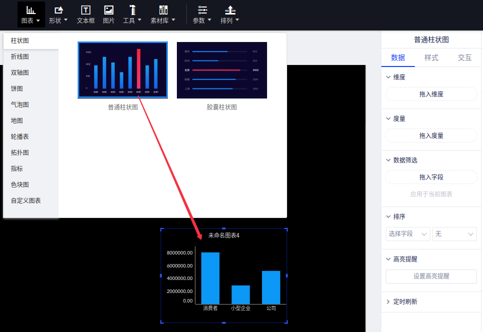 (1)选择“图表”控件,找到“普通柱状图”并添加到画布中;