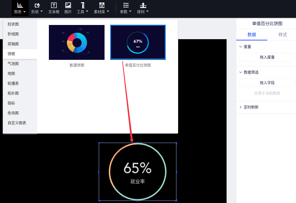 (1)选择“图表”控件,找到“单值百分比饼图”并添加到画布中;