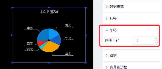 半径设置可以设置扇区圆心空白处半径大小,内圈半径设置大小和显示情况和饼图的大小息息相关,饼图越大,半径大小越慢达到上限,饼图越小,半径大小越快达到上限。