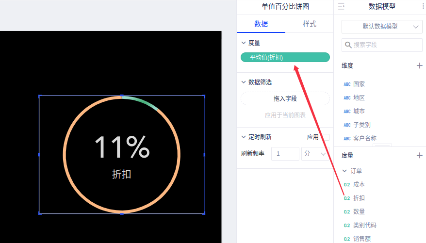 这里我们假设需要看“平均销售折扣率”饼图,将涉及到1个字段:度量“折扣率”。
