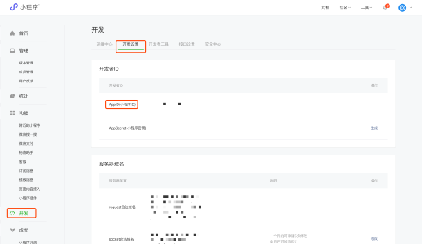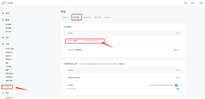 (3)第三个参数,需要在小程序的管理后台获取,点击开发-开发设置,查看AppID(小程序ID);