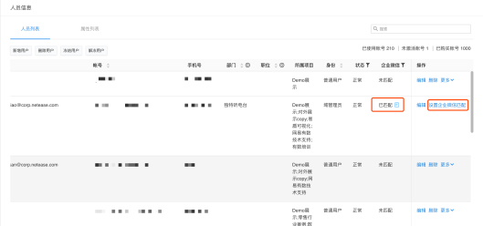 用户在企业微信上首次登录小程序后,在企业域管理-人员信息页面的人员列表可以看到已匹配用户的基本信息,且该用户下次即可在企业微信免密登录小程序。