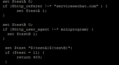 - 进微信小程序服务器可访问该域名,具体操作为nginx配置为仅限指定user_agent访问,小程序的user_agent为