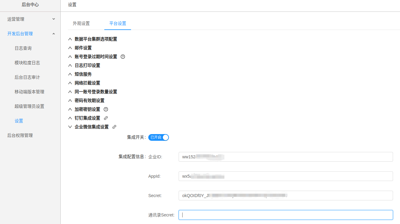 (4)在产品管理后台的设置页面,可以对企业微信集成的开启进行控制,若要在企业微信中启用小程序,首先在[企业微信集成设置]下打开集成开关,其次填写上文所说的三个参数:企业微信后台提供的企业ID、Secret,以及小程序管理后台提供的AppID。