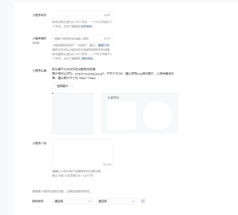 内容包括小程序名称,小程序简称,小程序头像,小程序介绍,及服务类目(服务类目选择工具-计算类)