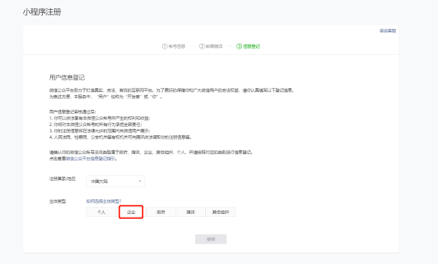 信息登记 选择企业为主体类型(个人认证无法配置业务域名这里必须选择企业)