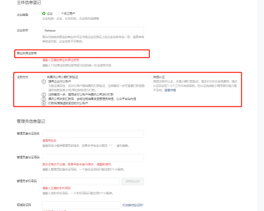 登记主体信息,需要营业执照注册号及注册认证,认证方式有两种: