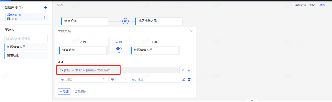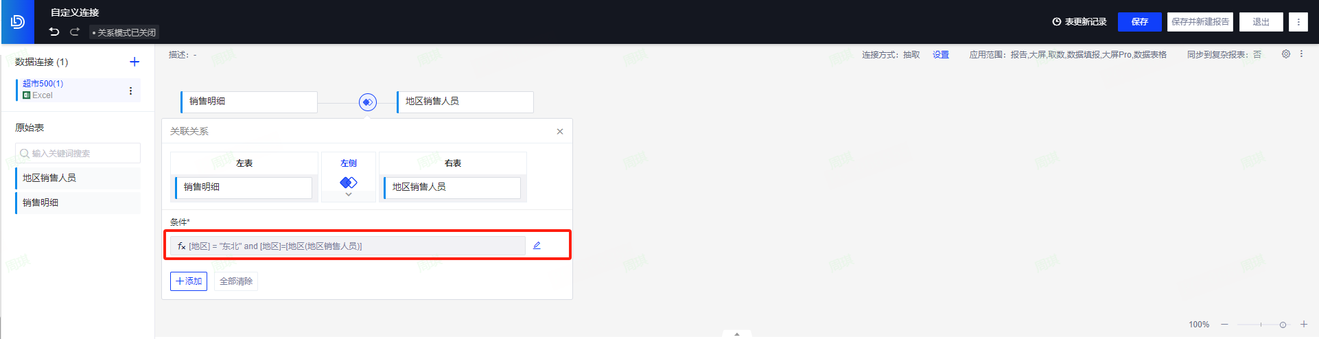 数据模型中表关联可以自定义关联条件,原来的关联只能是多个筛选之间取交集,现在支持自定义设置关联条件,可进行or和null值的过滤。自定义关联条件返回值必须为布尔类型,会保留True的数据,操作步骤如下: