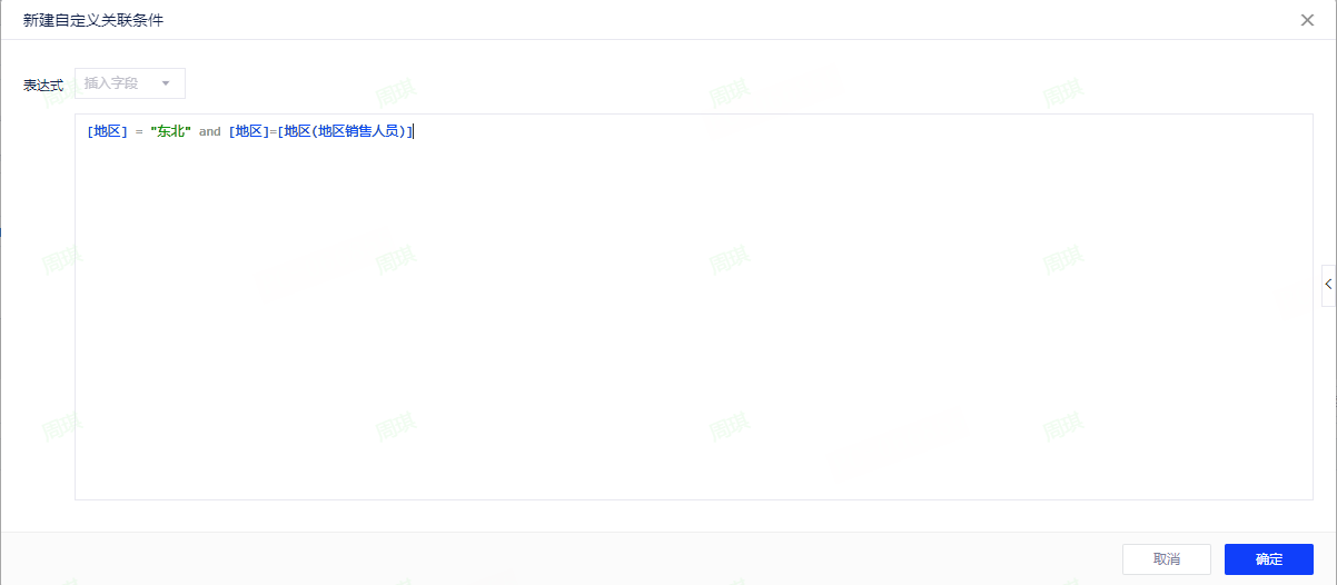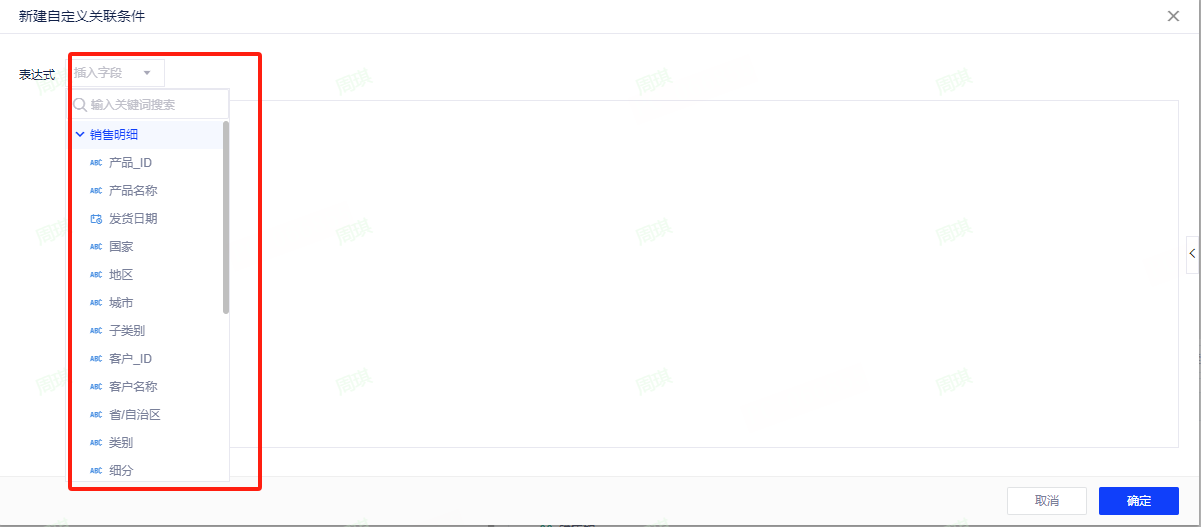 (2)进入自定义关联条件界面配置界面。选择表中字段进行关联条件表达式的配置。