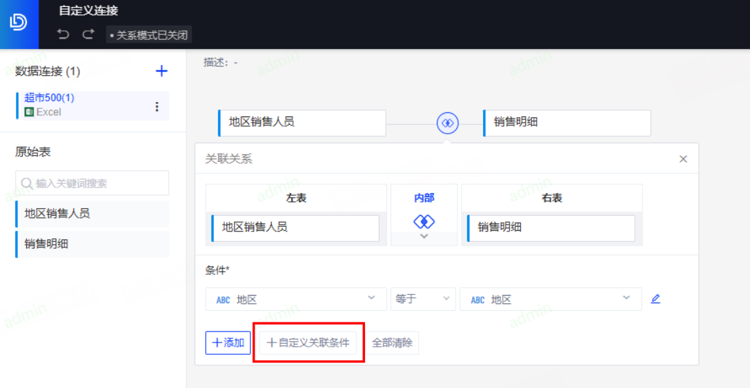 (1)进入关联关系配置界面,点击自定义关联条件。