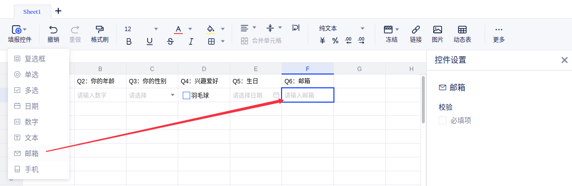 如果您需要搜集邮箱类型的数据时可选用“邮箱”控件,可在控件设置处可以设置校验。