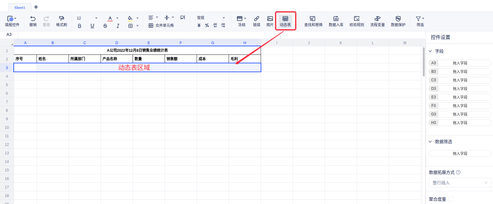 (1)创建好表头后,选中单元格后点击动态表,则该区域为动态表区域(动态表只需选择一行数据)