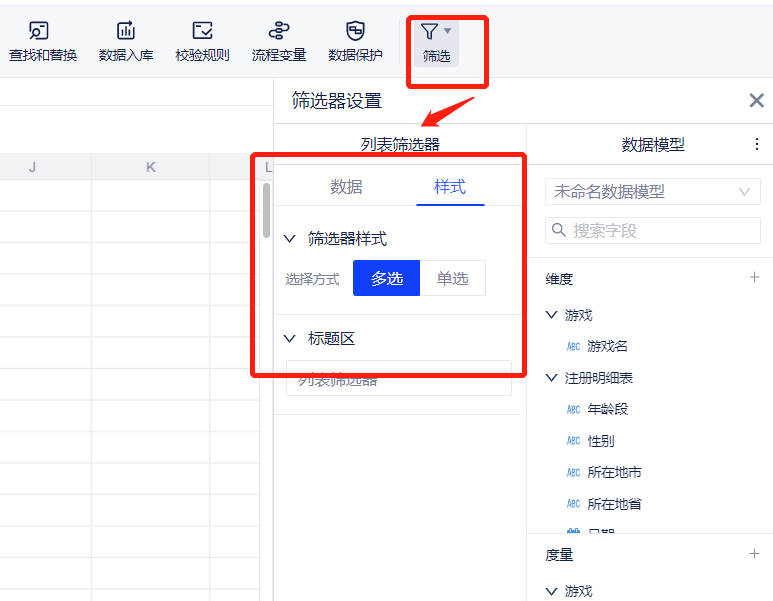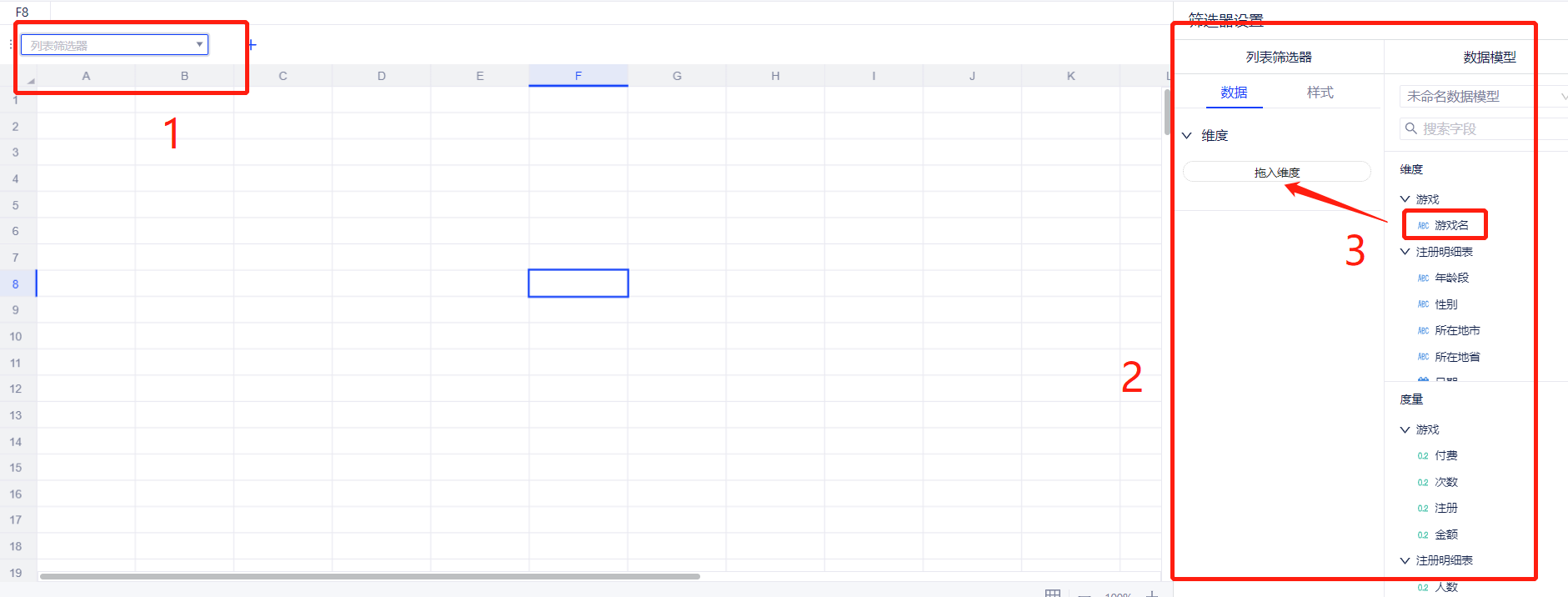 (2)添加数据模型,将将数据模型中的字段拖入即可完成筛选器的配置