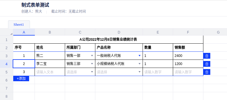 (3)在预览或填报状态,点击添加按钮可以动态增加行,输入多条记录