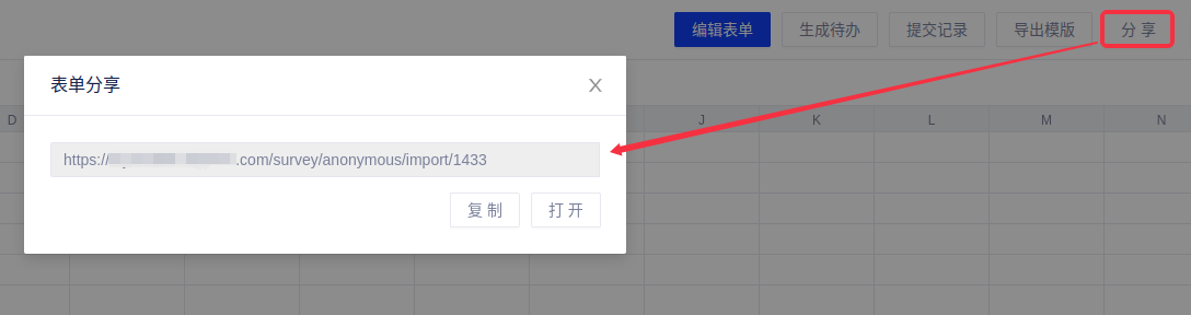 由于匿名表单在填写时,填报人不需要登录系统,所以点击右上角的[分享]按钮后将直接展示表单链接,您可以在复制链接后发给填写人
