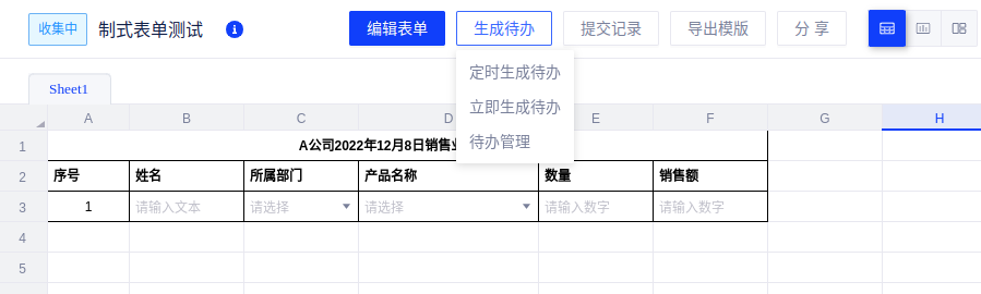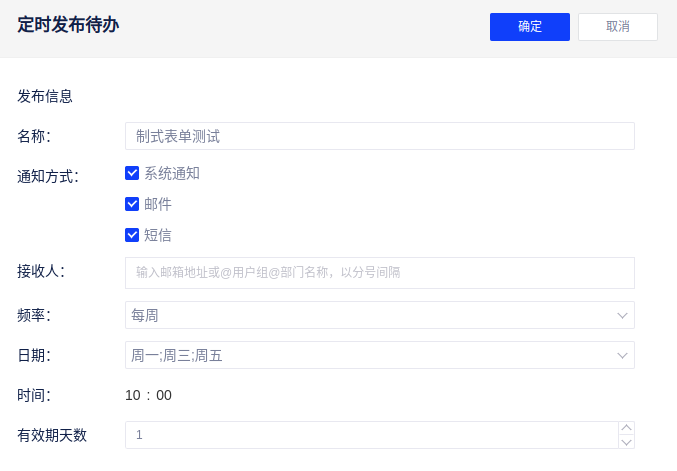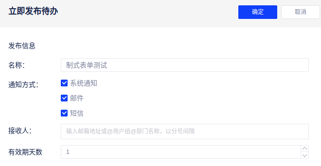 表单发布后,通过该功能可以通知填写人,但填写人必须是项目内的用户。待办生成方式分为定时待办和立即待办两种。