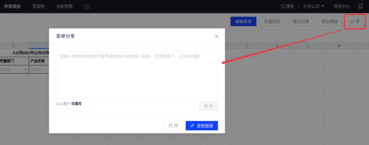 在表单列表页面,点击右上角的[分享]按钮,然后复制链接发给填写人。您还可以在这里指定本项目中的用户、用户组或部门填写(指定后其他人将无权填写),可添加多个