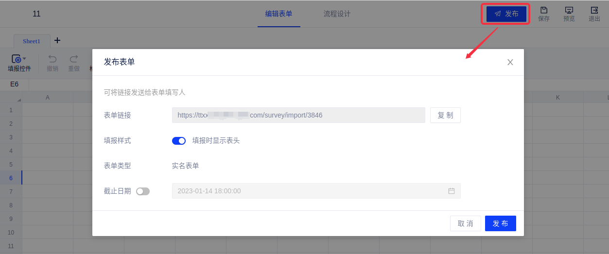 (1)选择需要发布的表单并进入其编辑页面,然后点击右上角[发布]按钮