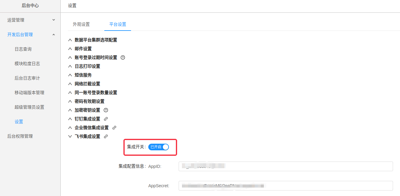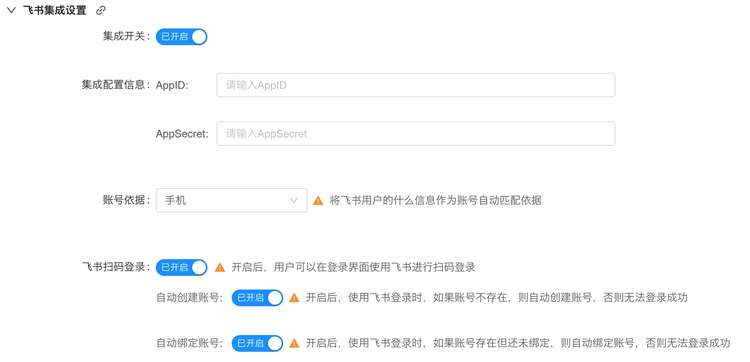在产品管理后台的设置页面,可以对飞书集成的开启进行控制。若要使用飞书登录,首先在[飞书集成设置]下打开集成开关,其次填写集成配置信息的两个参数:App ID和App Secret。