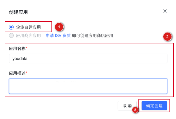(2)点击创建应用,在创建应用页面,选择企业自建应用,并填写应用名称和应用描述,点击确定创建;