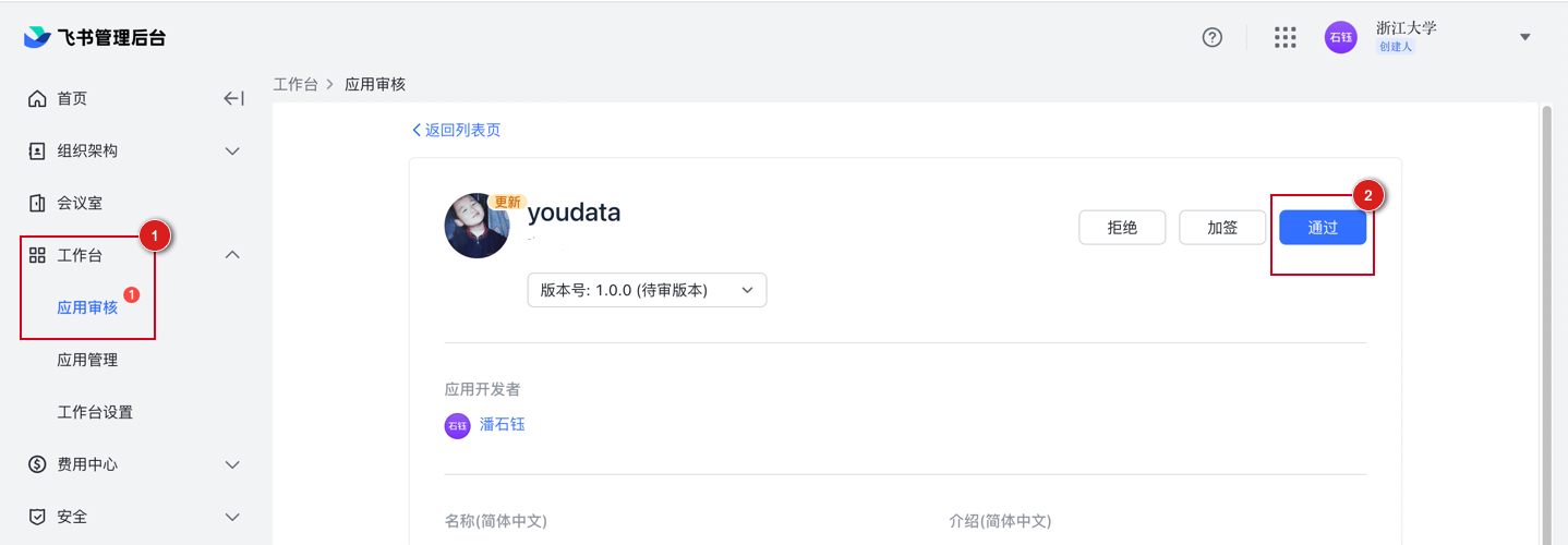 (2)在飞书管理后台左侧导航栏中选择工作台-应用审核,在应用审核页面点击通过;