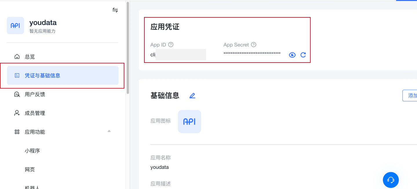 (4)在应用详情页面,点击左侧导航栏的凭证与基础信息,在应用凭证区域获取App ID和App Secret。在基础信息区域上传应用图标。特别注意:应用凭证这两个参数将填写至产品管理后台!