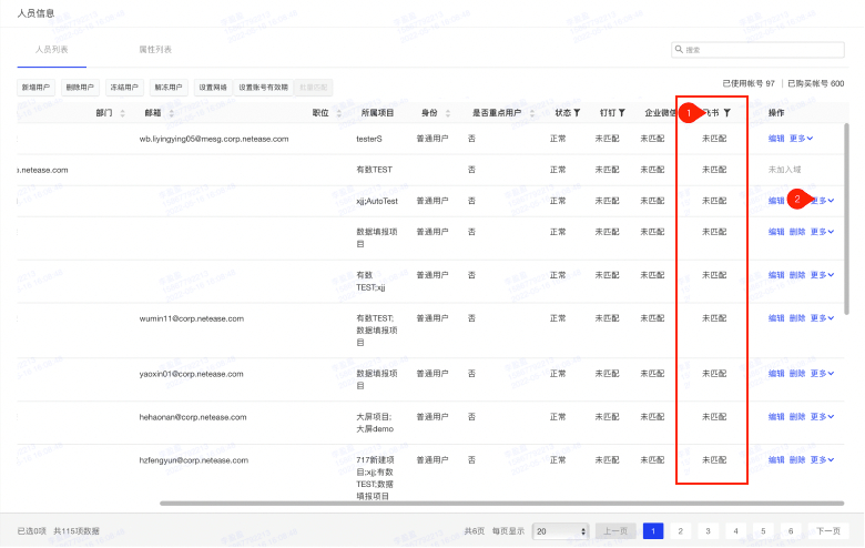 开启自动创建账号和自动绑定账号开关,用户首次使用飞书登录后,在[企业域管理-人员信息]页面的人员列表可以看到已匹配用户的基本信息,且该用户下次即可使用飞书免密登录。