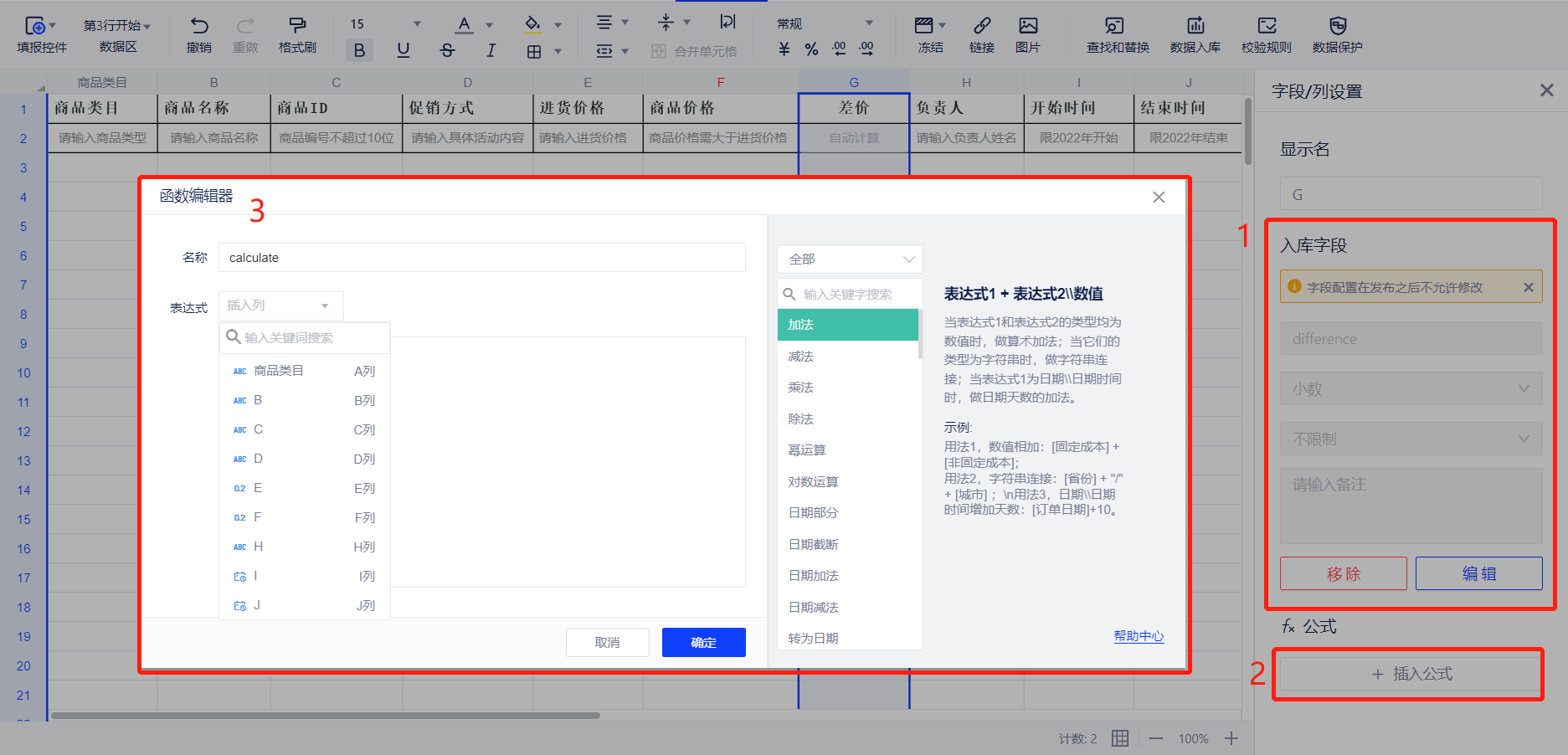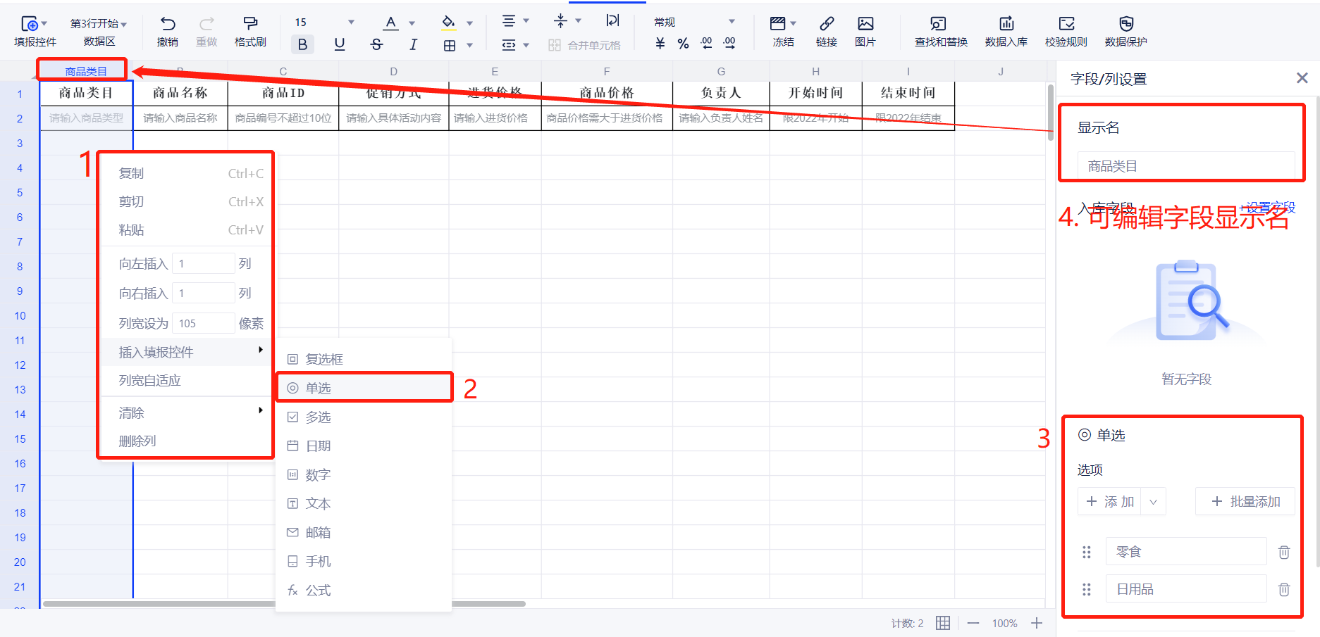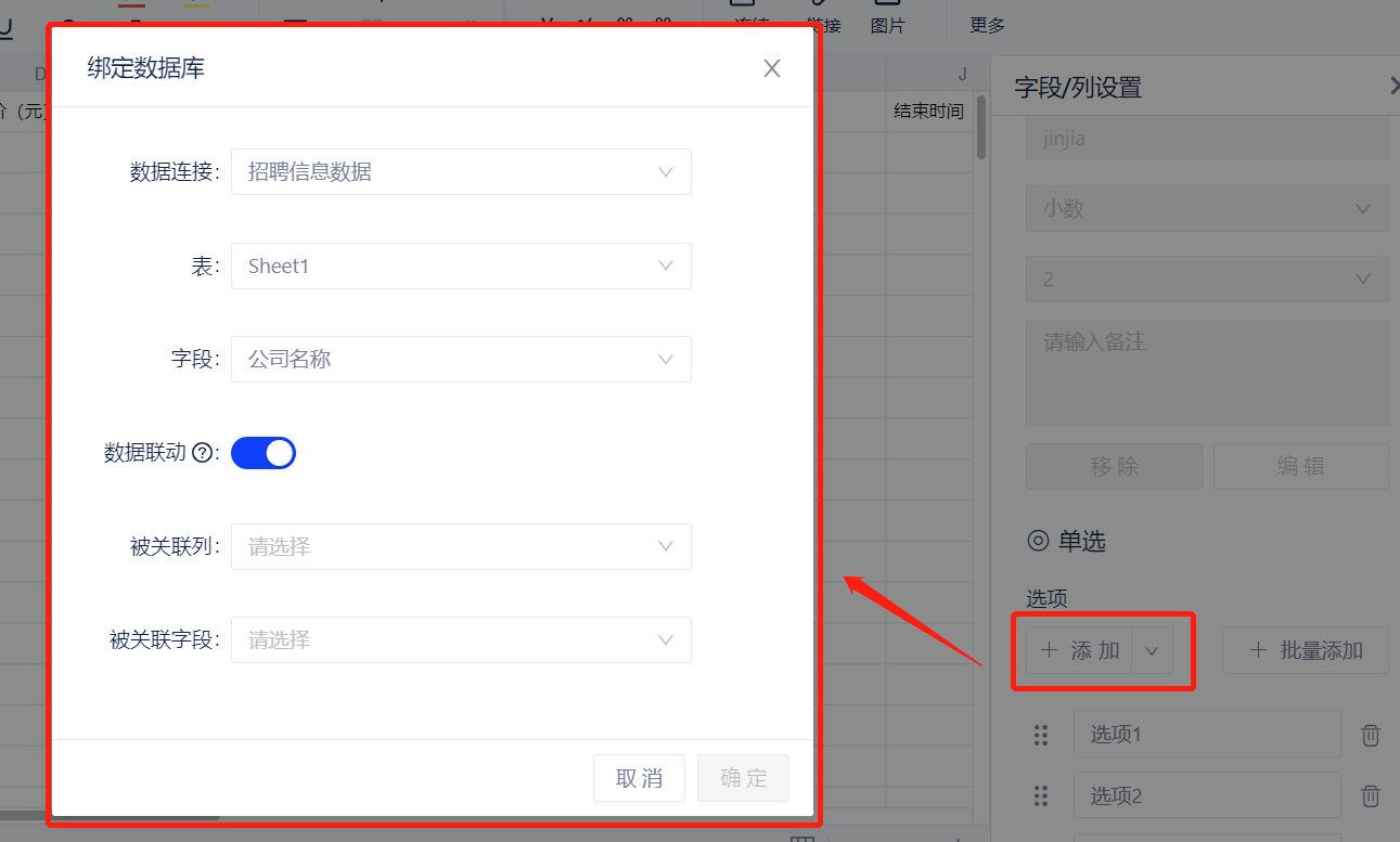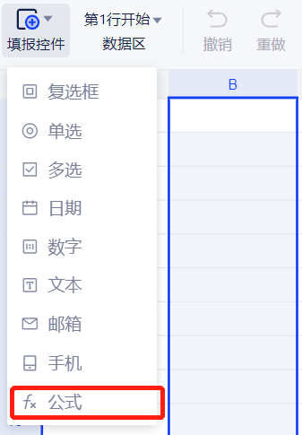 1. 概述2. 快速入门1. 概述页面填报时需要使用控件来修改单元格中可填报的值类型,选择需要定义控件的单元格,点击顶部工具栏填报控件按钮,就可以向表单内添加填报控件了。本文将为您介绍各种控件的用法及注意事项。 2. 快速入门(1)在动态表格中,仅支持按列批量配置填报控件。而相较于制式表单控件,动态表格中新增公式控件 (2)选中列后右键,可为该列设置填报控件 当填报控件为公式时,设置入库字段,即可进行函数编辑 当填报控件为单选/多选时,选项配置可以与数据表中的字段联动,在选项中选择需绑定的数据库,即可进行配置