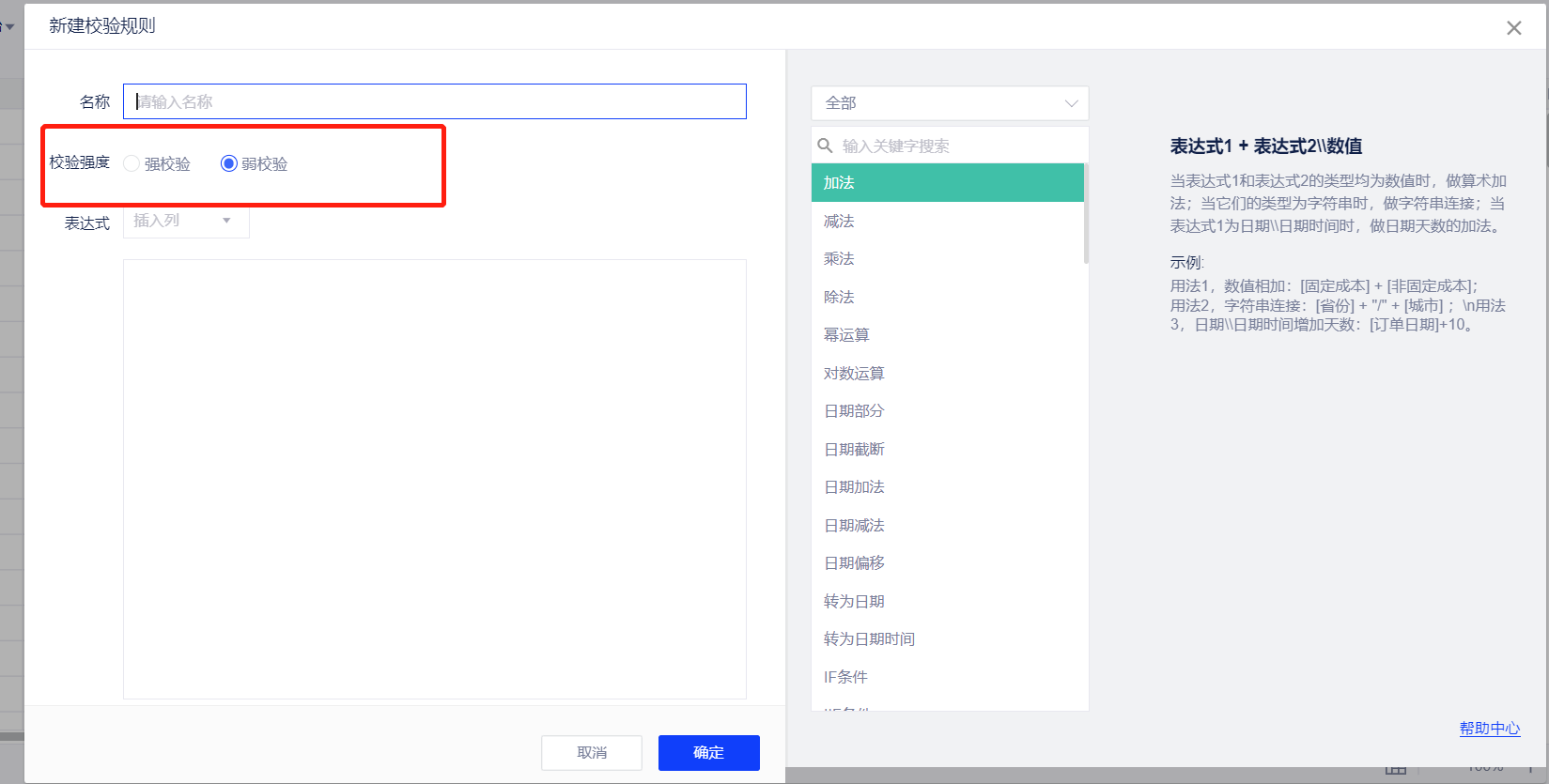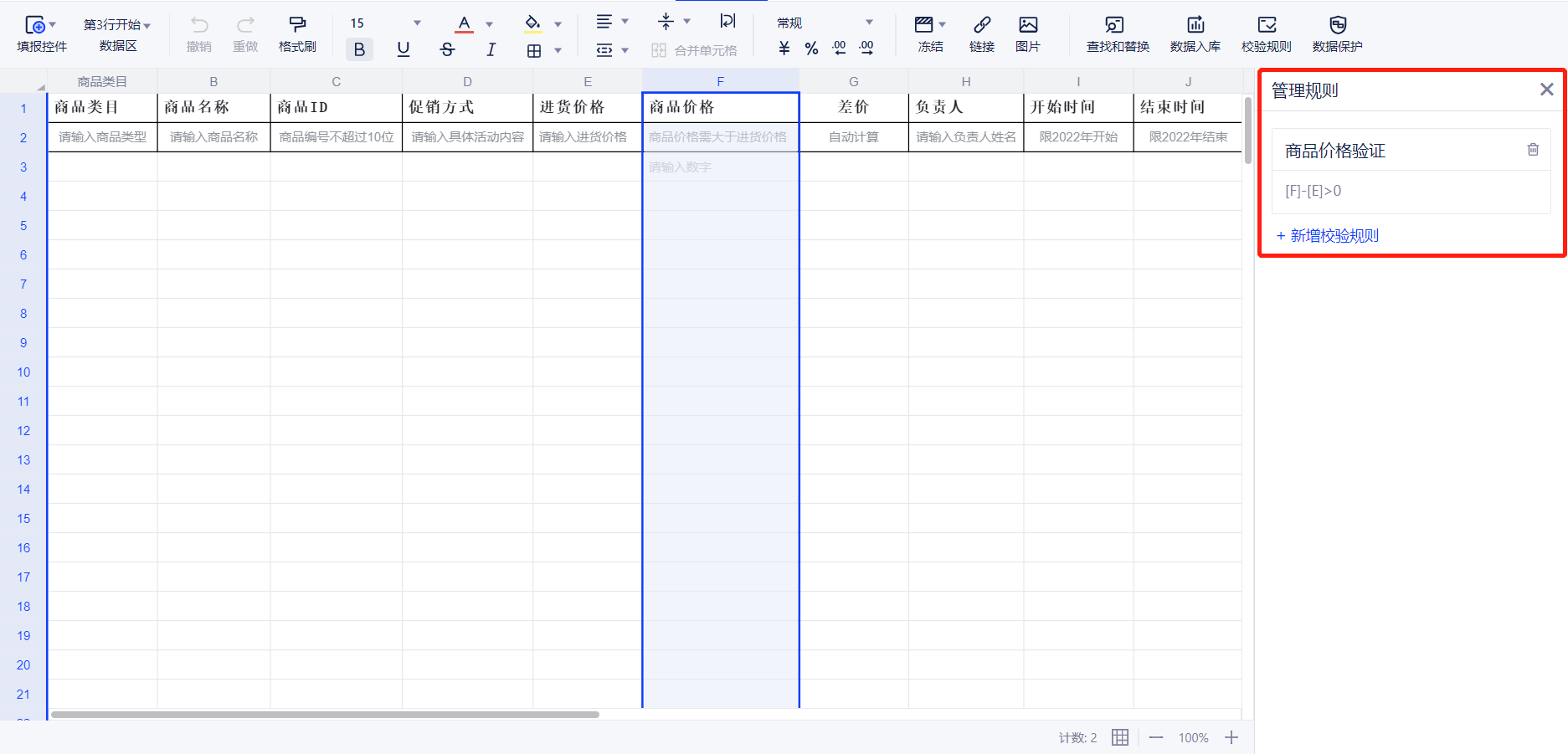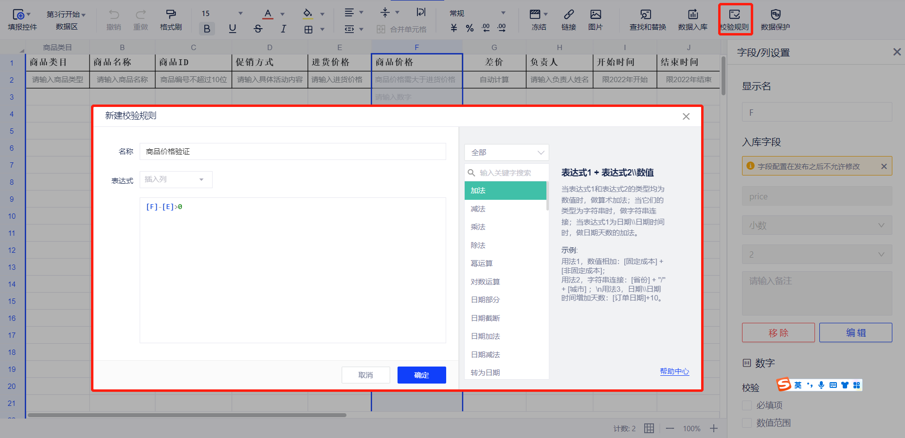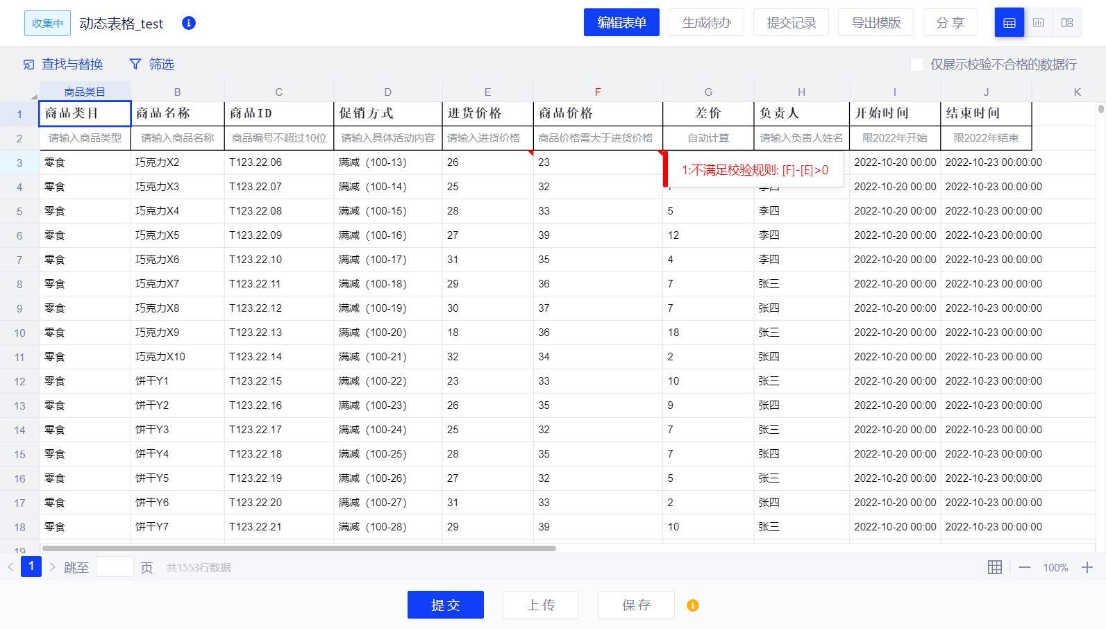 1. 概述2. 快速入门1. 概述动态表格支持向表单添加基于Excel公式的自定义校验规则。 2. 快速入门(1)在动态表格编辑页面,点击校验规则按钮,可以配置校验公式 (2)完成设置后,可在侧边栏中查看与管理规则 动态表格支持配置校验模式为强校验或弱校验 (3)在单次上传或批量上传数据时,本产品都会自动校验数据,并在页面中显示