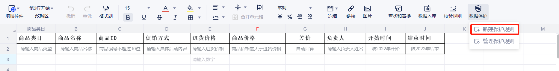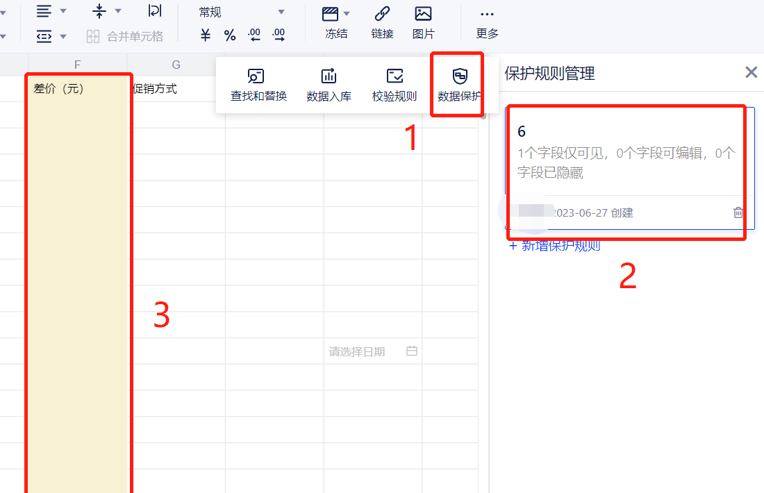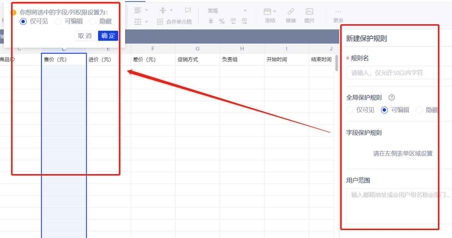 1. 概述2. 快速入门1. 概述动态表格支持设定单元格权限,可设置不可编辑区域、可写区域以及隐藏敏感数据。同时,开发者可以赋予不同用户不同的权限,使其只能进行指定权限内的操作。 2. 快速入门(1)在动态表格编辑页面,选择数据范围可以进行数据保护,编辑者可以设置部分单元格的可读、隐藏、可编辑三种属性,隐藏状态下填写人无法看到数据,可读状态无法写入数据 (2)选择数据范围,即可设置字段保护规则。为其添加名称,点击确定完成创建 (3)完成创建后,可在数据保护的规则管理页面看到详情