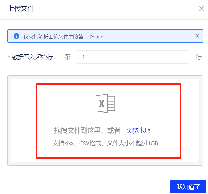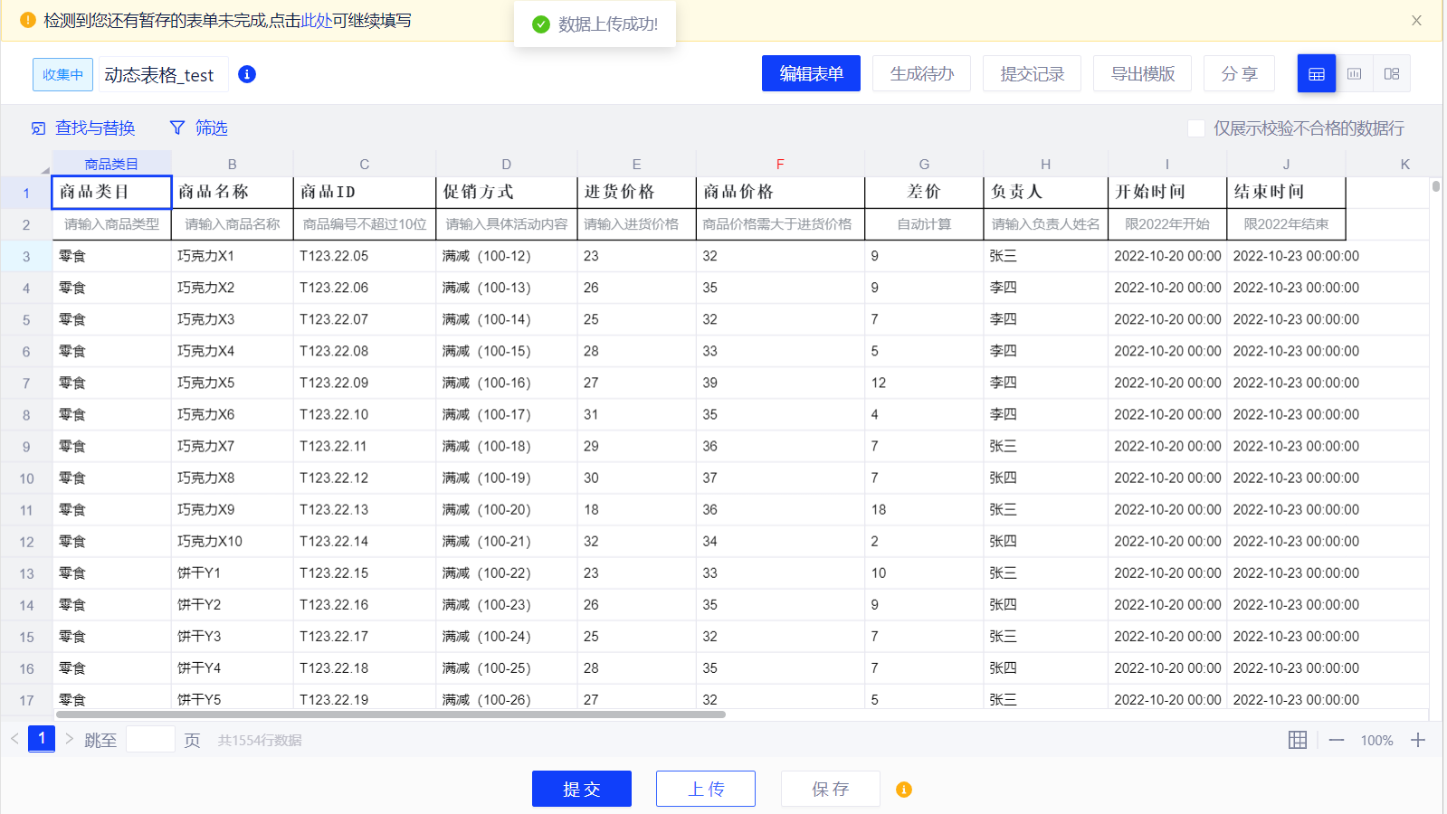 (2)批量上传:批量上传共分为三步,上传EXCEL或CSV文件、抽取、校验。上传文件后,选择数据写入的起始行和对应文件,系统会自动进行接下来两个步骤,点击提交完成操作。效果如下所示