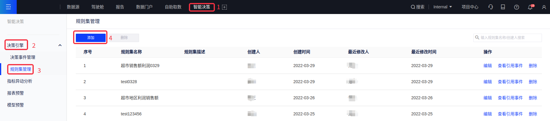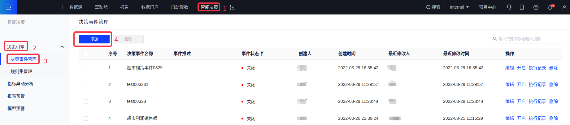 (1)决策事件管理列表支持添加决策事件,点击[添加]进入配置页面;