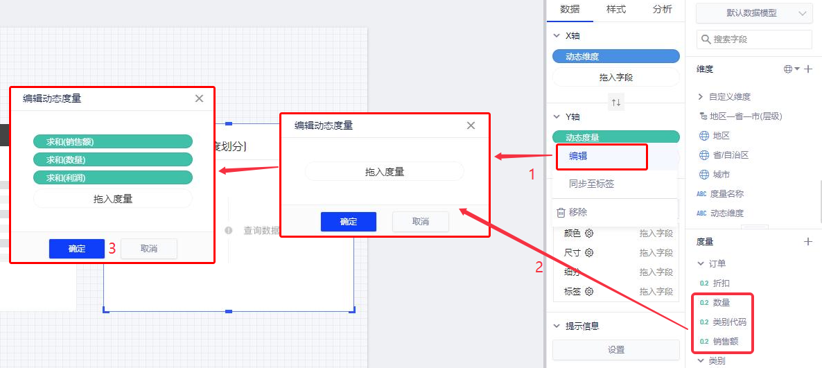(2)依次编辑动态维度和动态度量,拖入维度和度量,完成动态维度和度量的编辑设置。