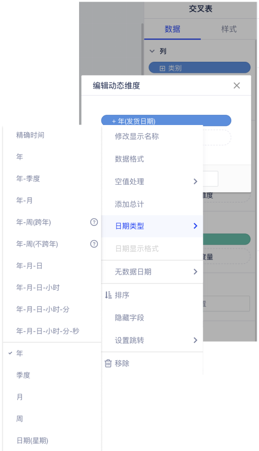 当交叉表、图表组件内拖入动态维度,并在动态维度内拖入日期类型字段时,日期维度支持年月日等多种日期类型,实现年月日的时间维度分析。