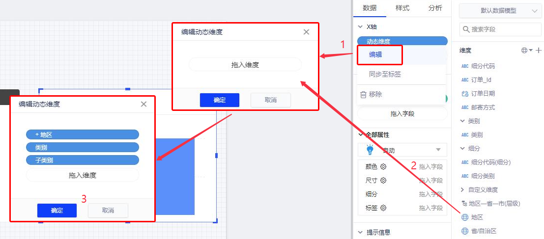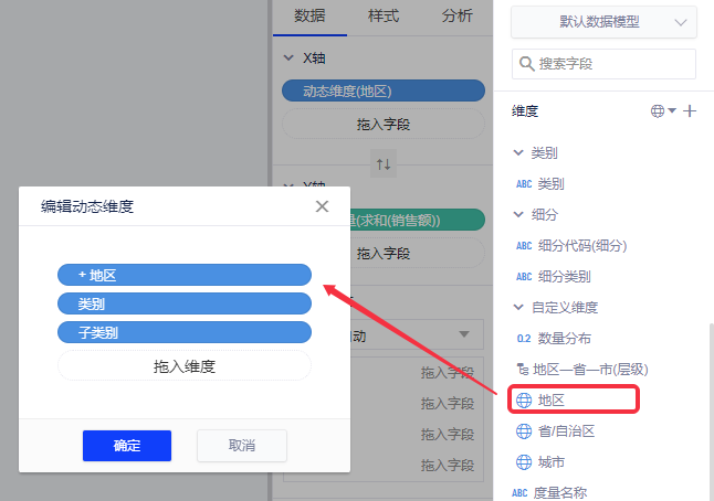 如图所示,将已创建的区域层级字段拖入动态维度面板,点击确认。