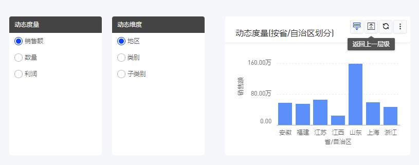 在阅览界面把动态维度切换到[地区]时,可进行点击下钻,上卷等操作。