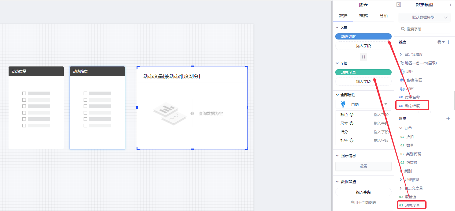 (1)在完成添加数据模型、插入图表控件后,将动态维度和动态度量分别拖入X轴和Y轴;