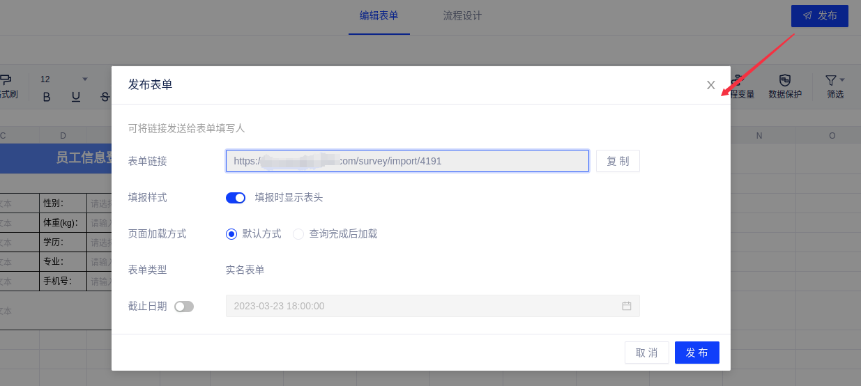 (2)逐条填写:打开表单链接地址,可以逐条录入员工信息或者将表单链接发给员工让其自行填写。