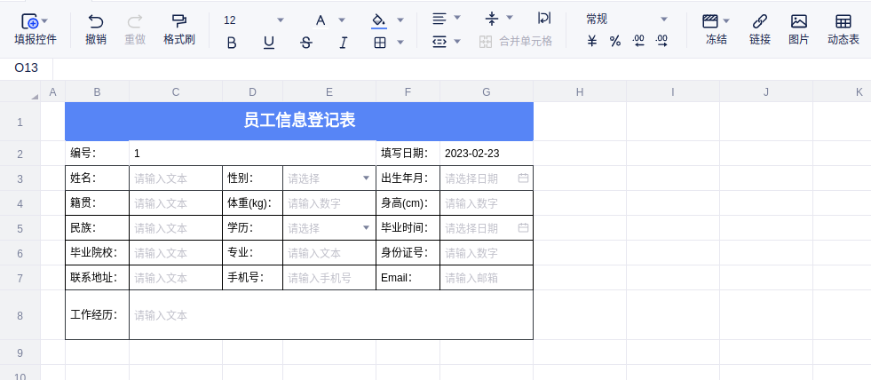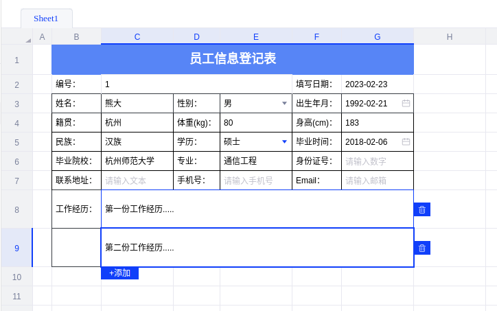(2)在表单编辑页面,姓名和籍贯等文本可使用文本控件、身高和体重可使用数字控件、出生日期和毕业时间等可使用日期控件、性别和学历选择的可使用单选控件。详细区别可查看:填报控件