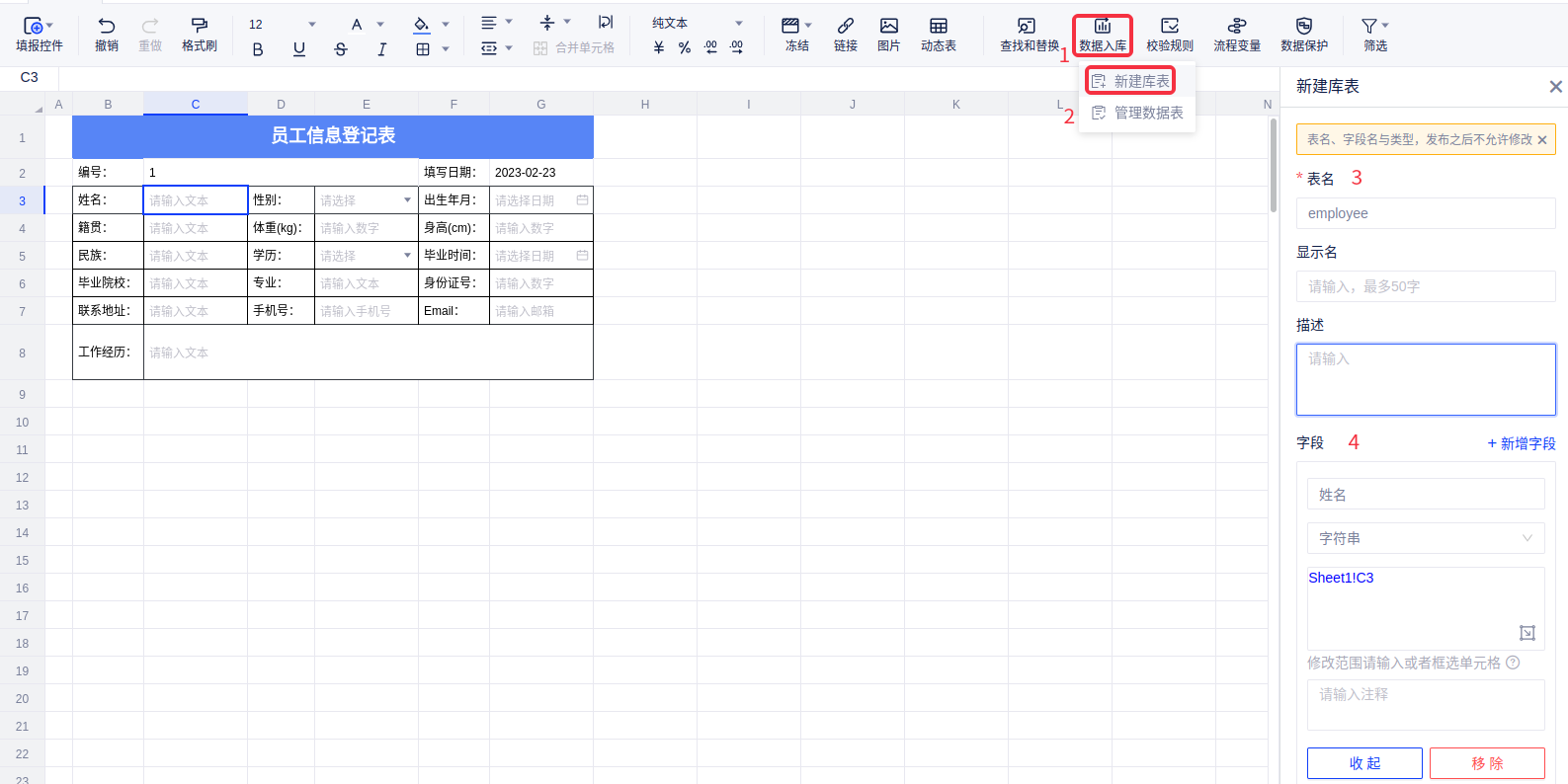 点击 数据入库-新建库表,即可新建一张该填报的写入表,然后为每个单元格控件创建对应的字段。功能详情可查看:数据入库
