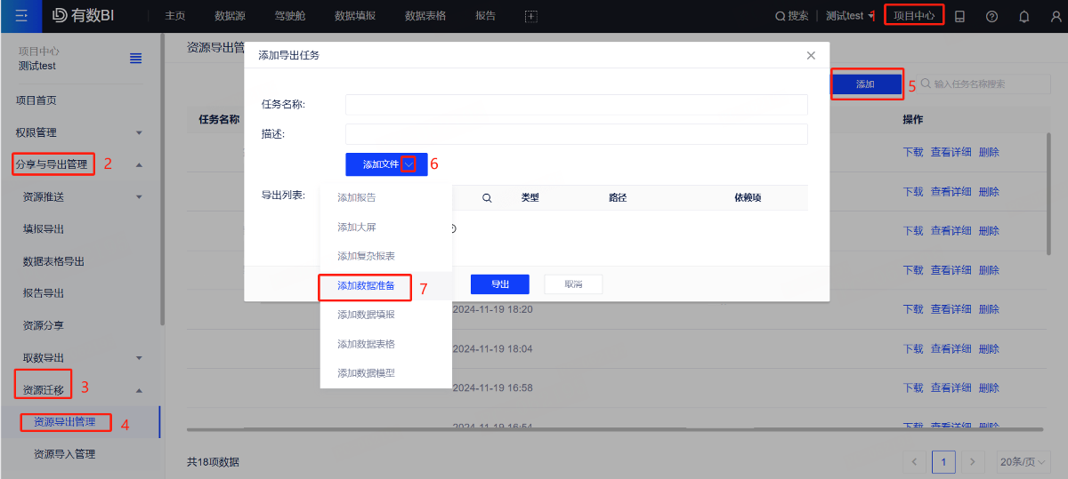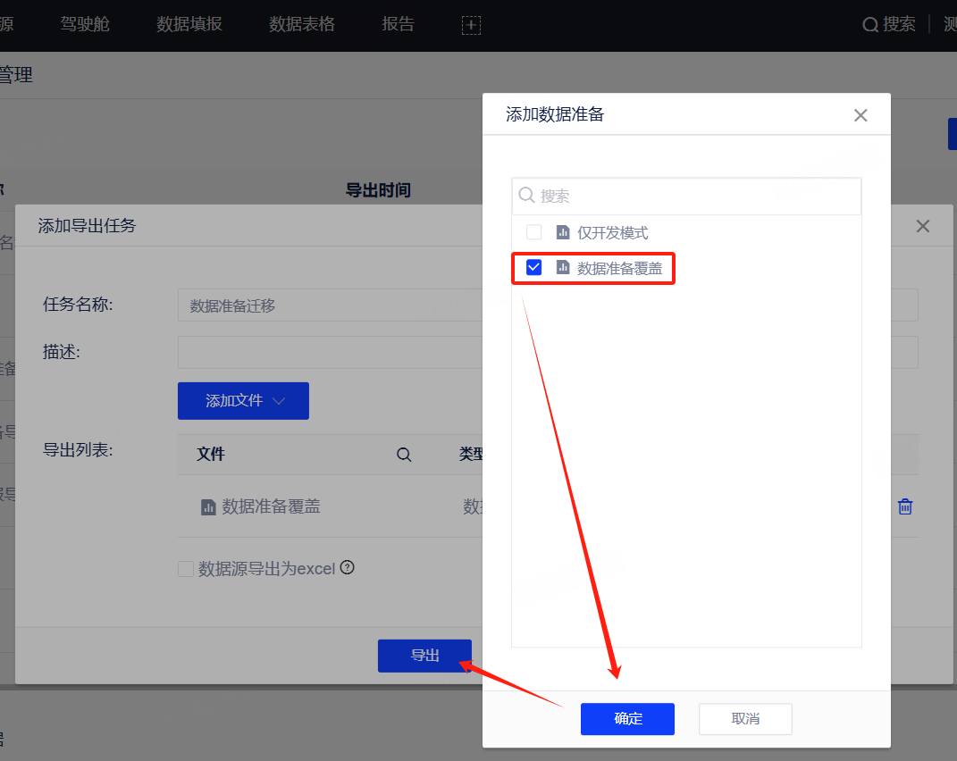(2)添加导出任务:选择数据准备文件,添加任务名称,并选择所需要导出的数据准备。