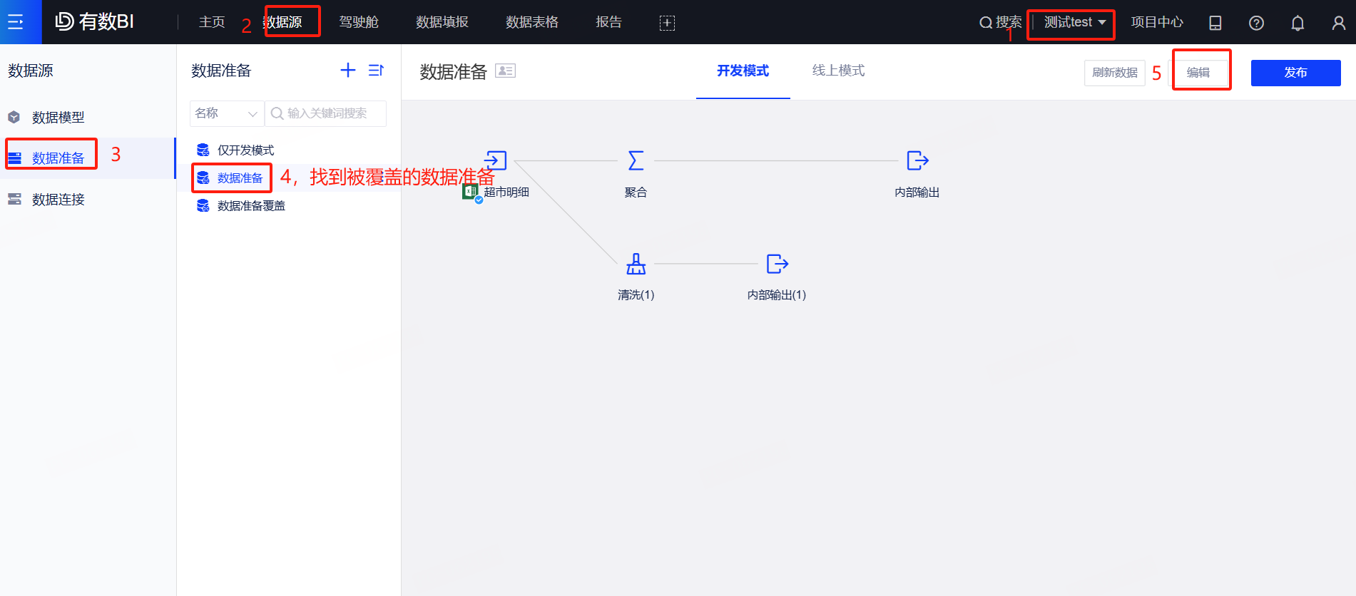 路径:点击数据源-数据准备-找到被覆盖的数据准备-编辑数据准备-删除对应输出表的输出节点;会提示依赖资源和依赖资源名称。