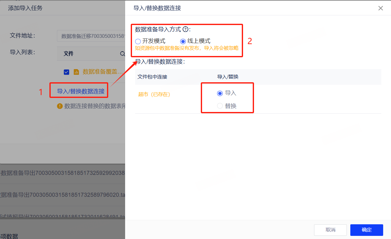 线上模式:只保留资源包中发布过的数据准备,若数据准备未发布,导入将被忽略。