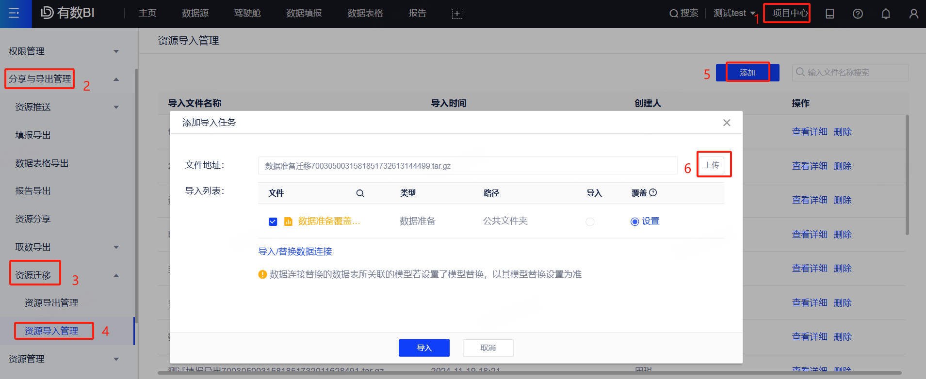 (1)导入路径:项目中心-分享与导出管理-资源迁移-资源导入管理-添加,上传离线文件;