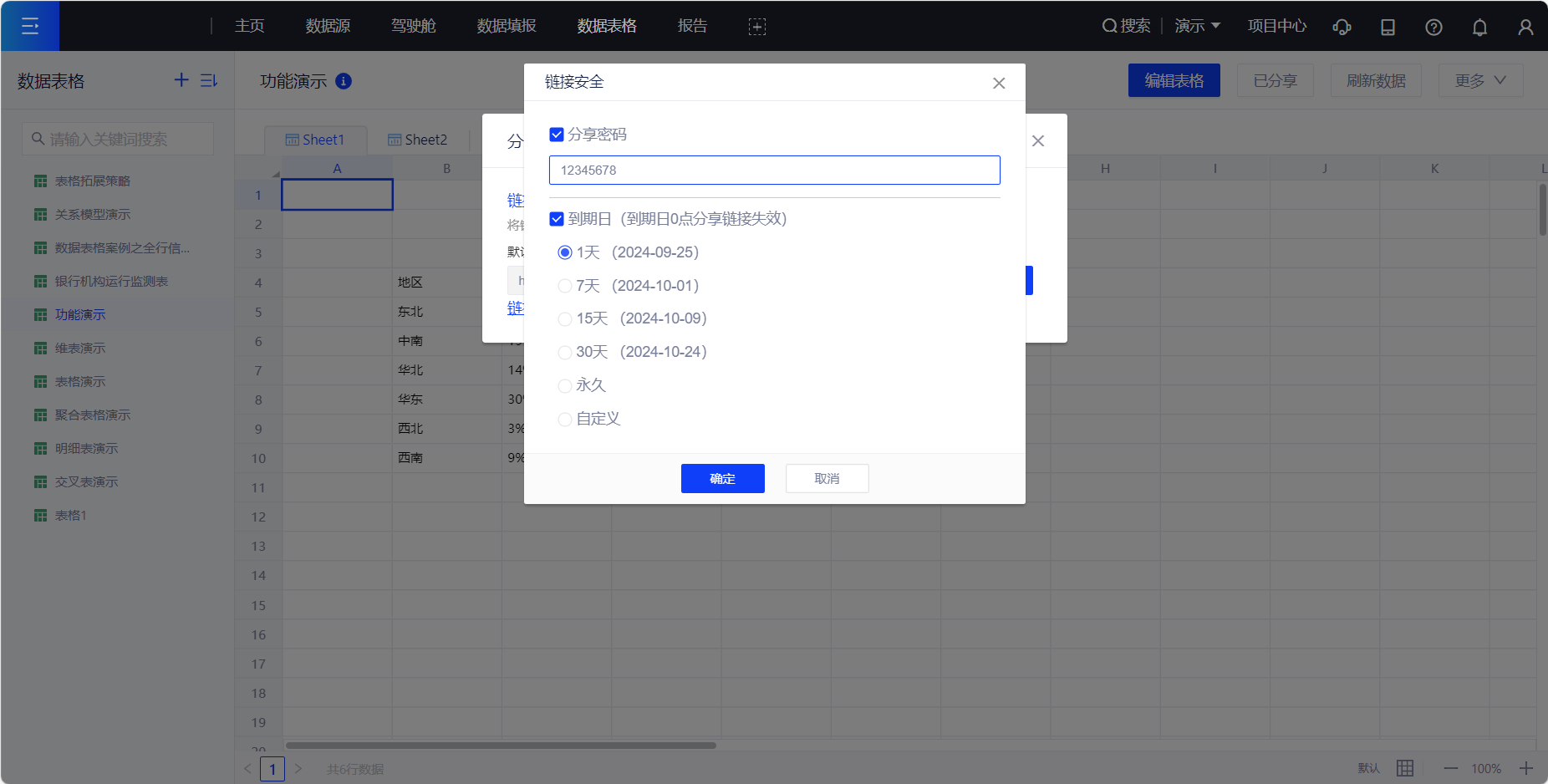 1. 概述2. 快速入门1. 概述用户可将数据表格以链接的形式分享给他人,其他人无需登录即可查看数据表格。 2. 快速入门(1) 产品入口 阅览态 --> 分享。 (2) 产品功能 支持进行链接安全设置,包括分享密码及到期日。 再次点击分享按钮可取消分享或修改链接安全设置。 他人查看的界面如下图所示。