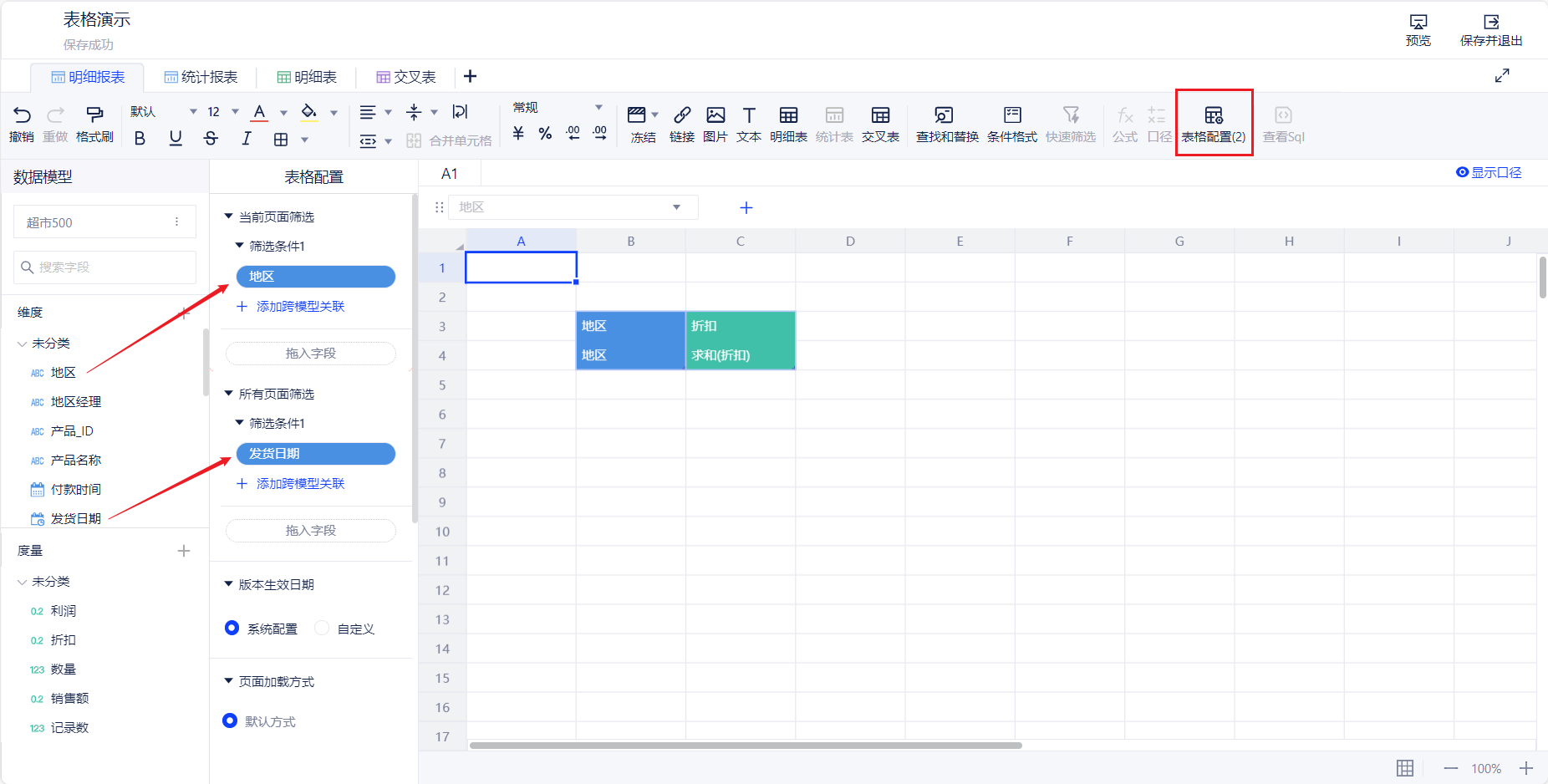 1. 概述2. 快速入门1. 概述在当前页面或所有页面范围内进行筛选。 2. 快速入门(1) 产品入口 顶部工具栏 --> 表格配置 --> “当前页面筛选”/“所有页面筛选”。 (2) 筛选配置 将需要筛选的维度或度量拖入“当前页面筛选”或“所有页面筛选”位置,在弹出窗口完成筛选配置,具体筛选方式见数据筛选。 (3) 跨模型关联 支持将当前筛选字段关联到其他模型的相应字段