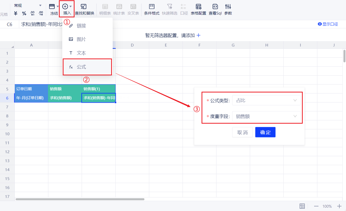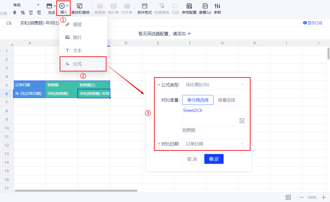 - 支持同比增长(%):计算和上年同期相比较的增长率。