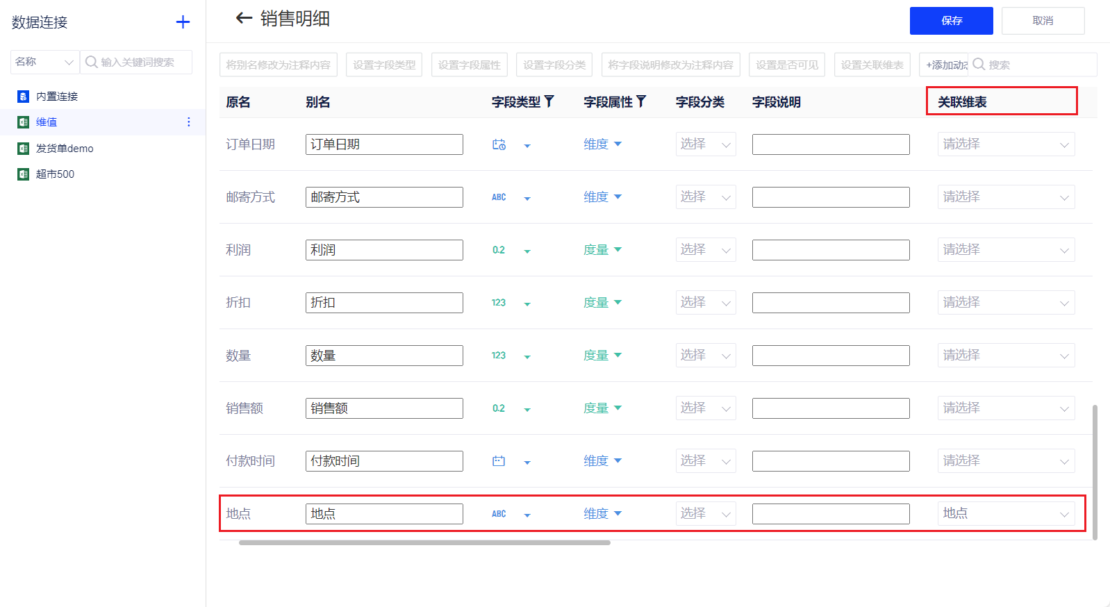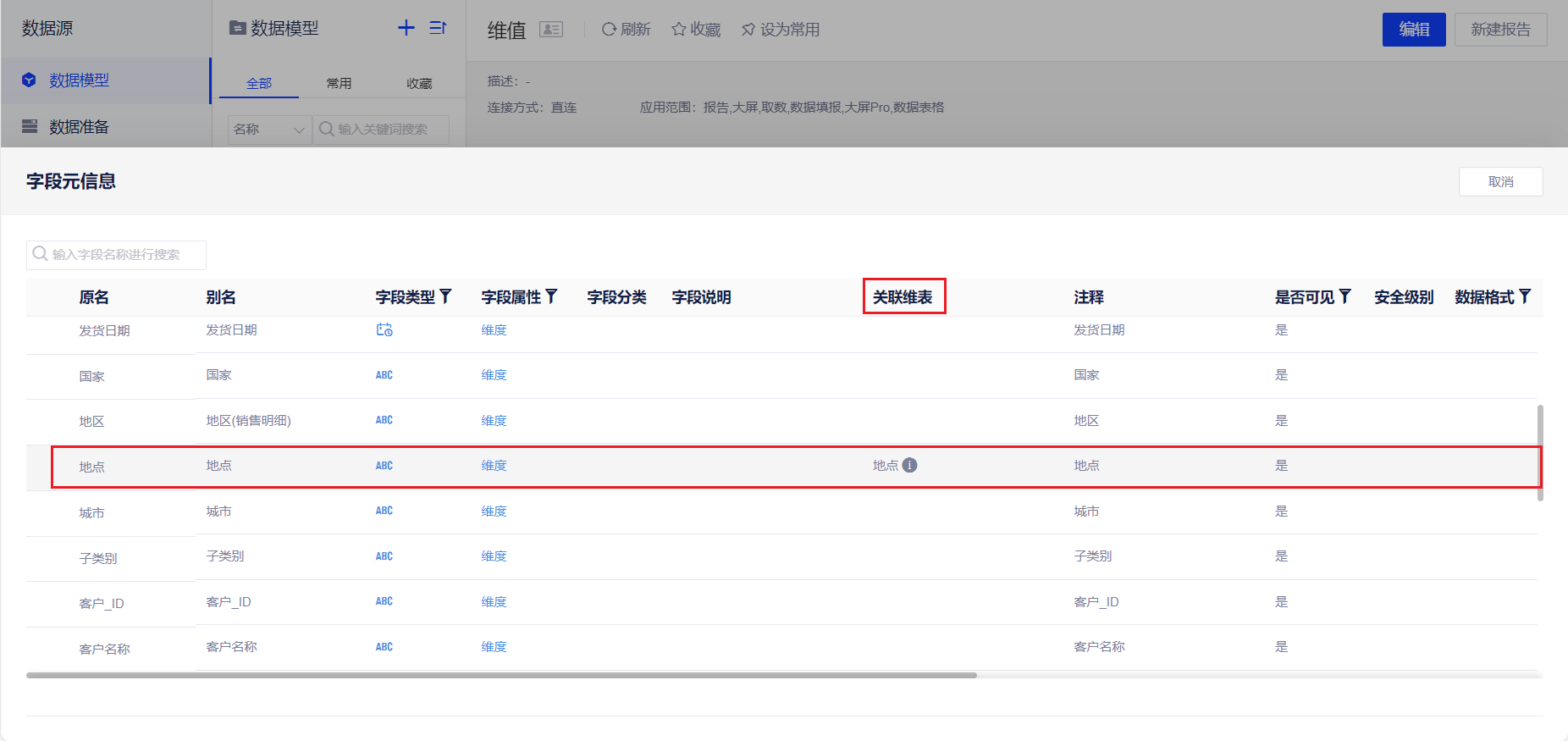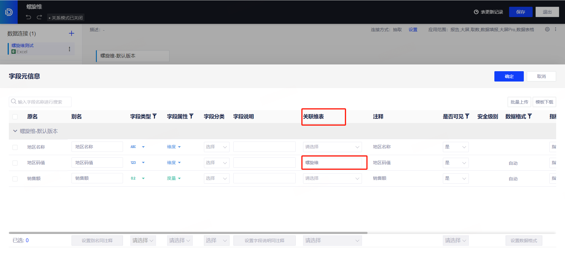 配置后在数据连接数据模型中字段将被关联至维表。