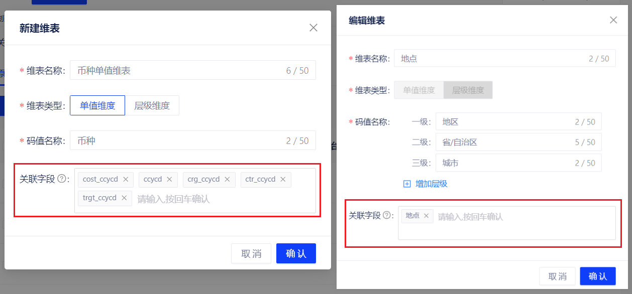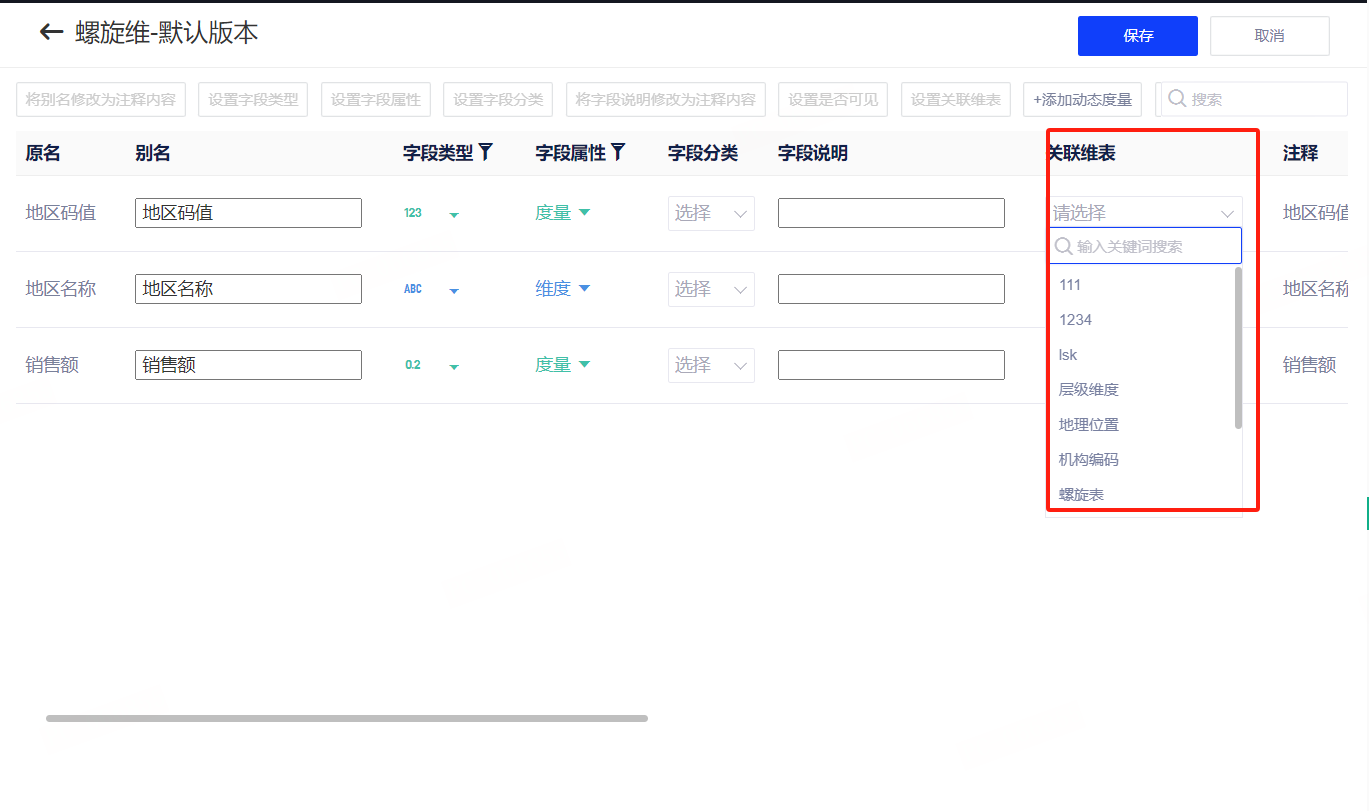 用户在新建维表或编辑维表信息时可配置维表关联字段,系统会将所有原名相同的字段绑定到这个维表。表格中用到的字段将会自动关联该维表。如果在连接和模型手动关联字段,将会优先关联。